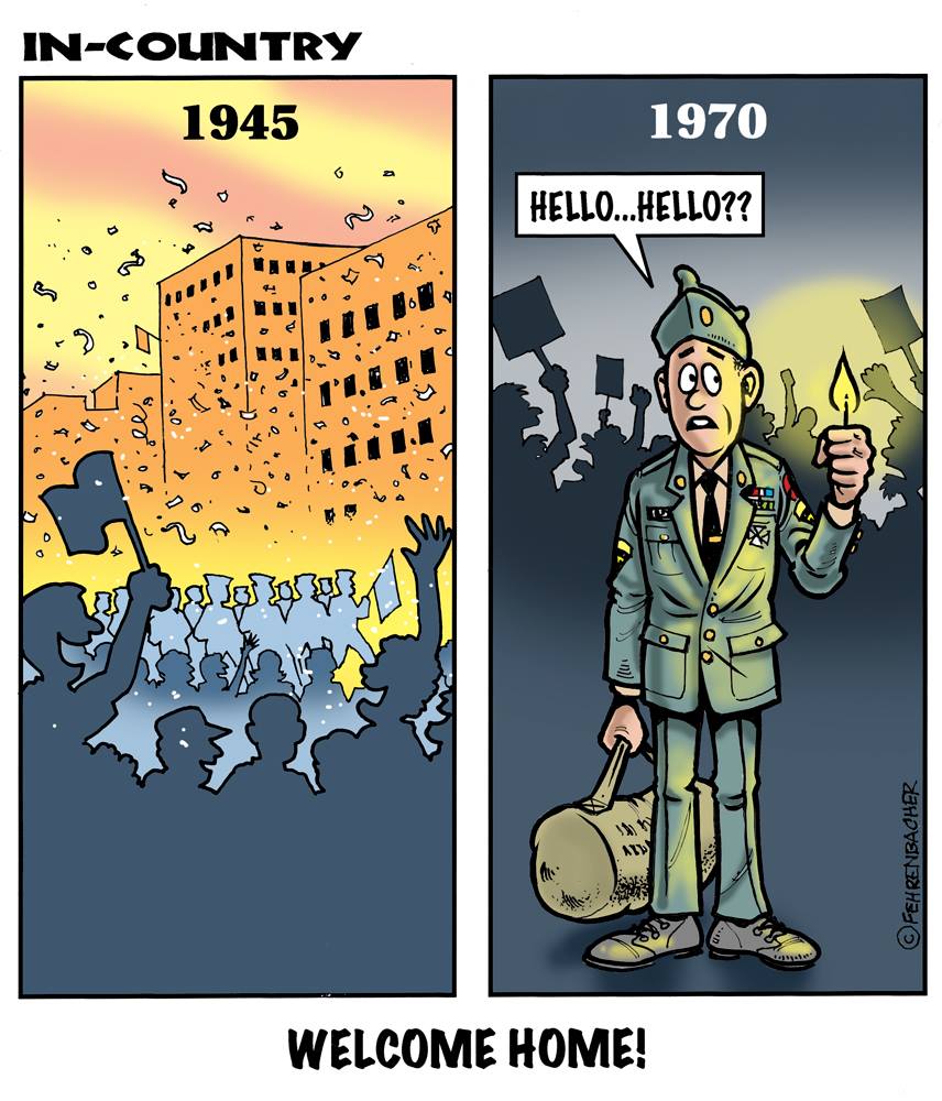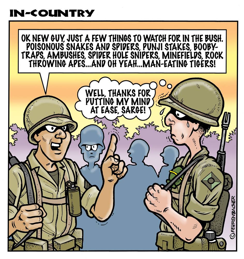 Phil enlisted in the Army in 1965 where you served for years in Vietnam. He became a graphic designer and has worked for the state of Oregon for 26 years. He retired in 2003 and started the Cartoon "In-Country". The cartoons reflect his experiences during his tour of duty in South Vietnam.